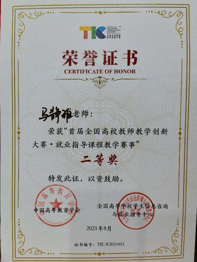 马静雅老师荣获首届全国高校教师教学创新大赛·就业指导课程教学赛事二等奖